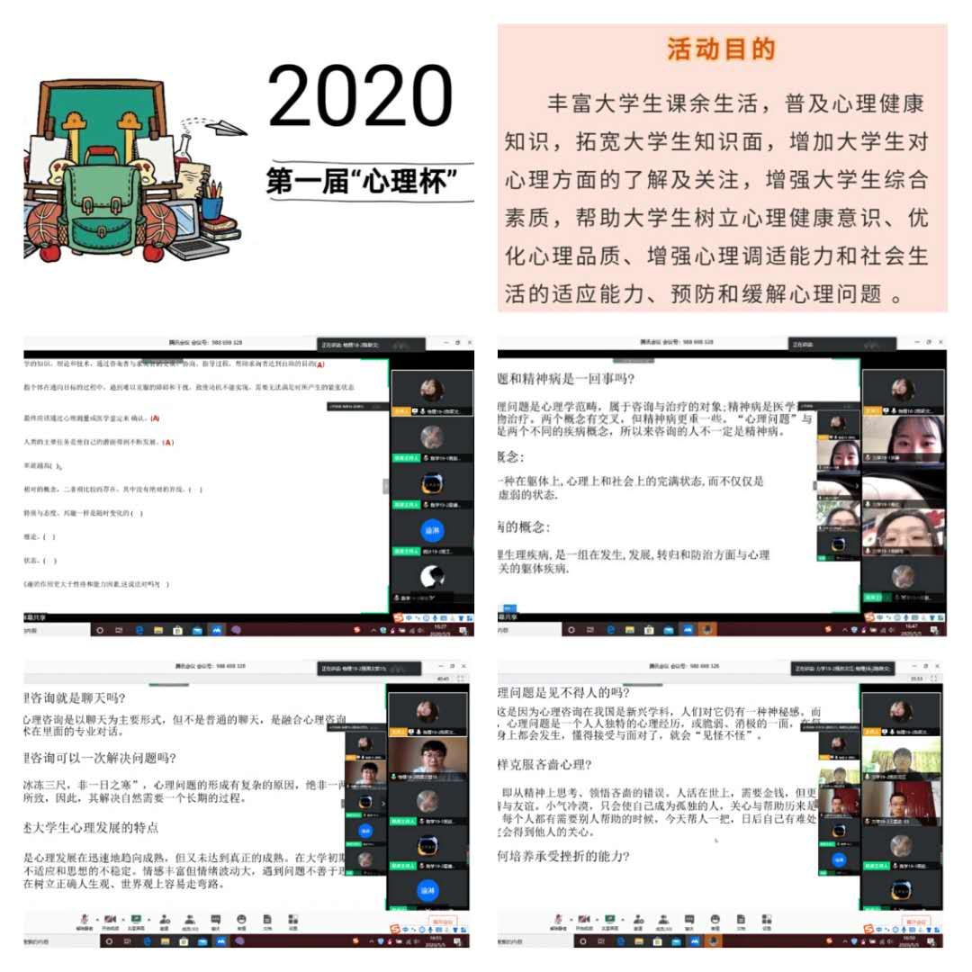 “心理竞答,‘疫’起来战”。此次活动以视频会议的方式进行比赛。参赛队伍由19级各班级派出三名选手参加,共24名参赛选手。比赛开始时,主持人对比赛规则和作答要求作了简要介绍,设有“志在必得”、“抢滩登陆”、“快人快语”以及“虎视眈眈”四个环节,题目主要包含防控新冠肺炎的知识、疫情压力下常见的心理应激反应以及自我调节等内容。经过最终的评比,统计19-2班、数学19-2班和物理19-1班获得前三名。