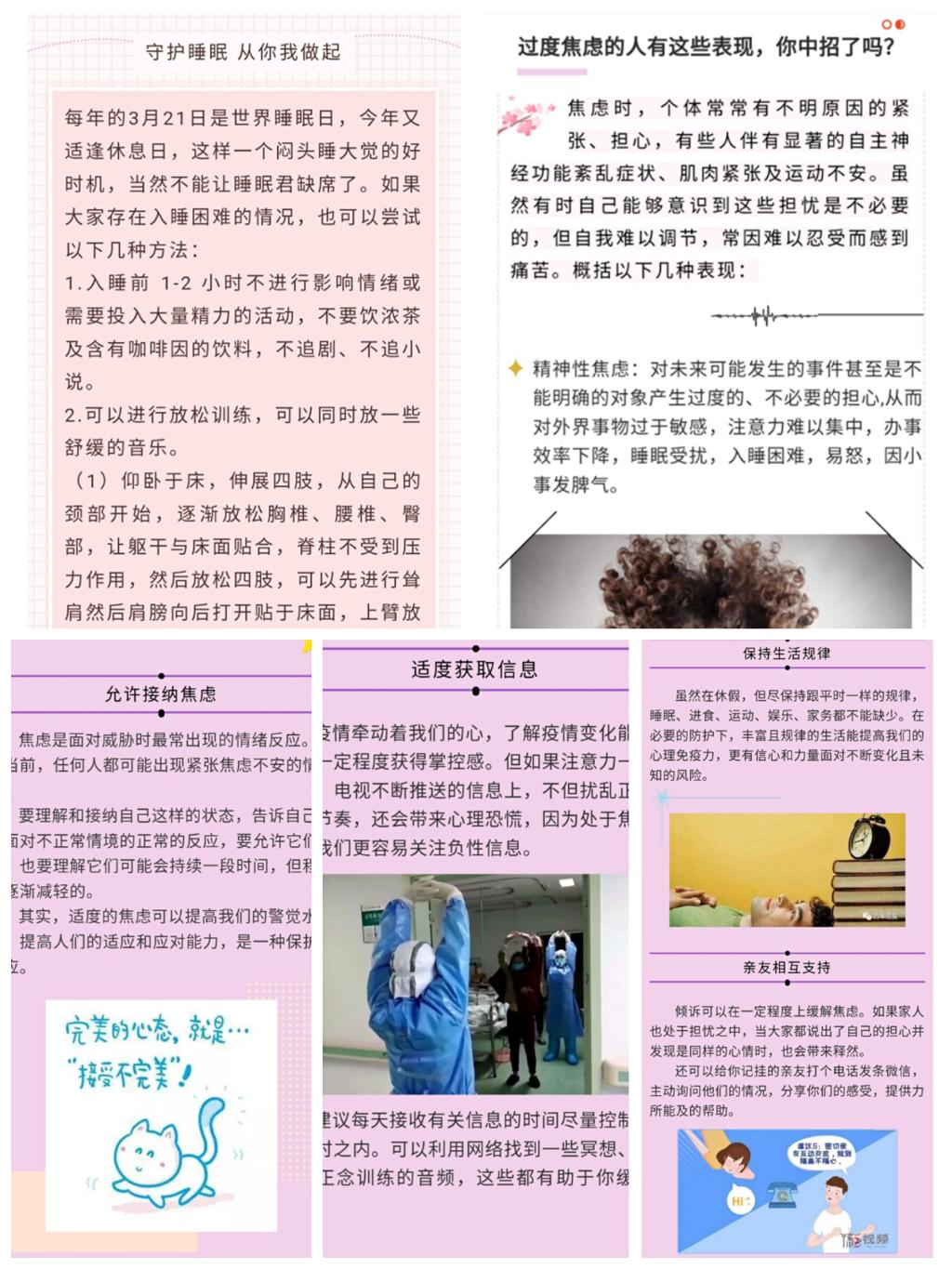 面对由疫情引发的“心理恐慌病毒”,ladbrokes立博积极参与员工处心理健康中心的疫情防控工作,同时为进一步加强疫情期间对全院员工的心理疏导,加强员工心理状况的调试,及时调整员工心理状态,科学有效的做好心理防护,并结合疫情期间的心理健康规律,公司开展了“心理防疫·同心同行”系列活动。