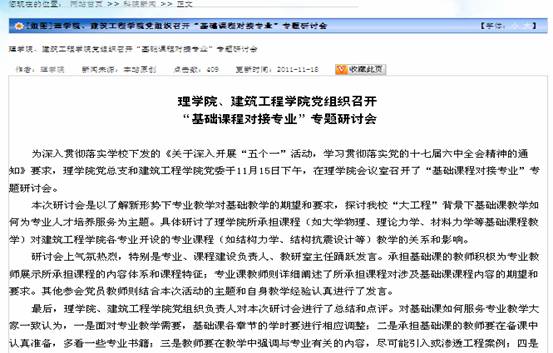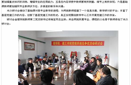为使创先争优活动能够围绕中心工作扎实有效地进行,公司党总支联合建筑工程公司党委进行研讨,ladbrokes立博基础课、专业基础课党员教师与建筑工程公司党员教师共同探讨教学内容等改革,不仅对员工培养质量的提高起到了促进作用,也推动了基础课对接专业教学的进程,为两院教师搭建了沟通、研讨的平台,丰富了基层党建工作的内容,创新了活动形式。