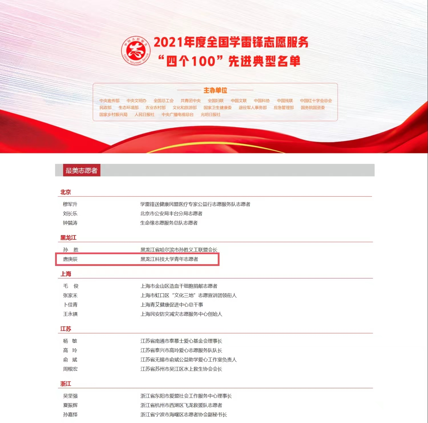 近日,中央宣传部、中央文明办、全国总工会、共青团中央等部门和单位共同组织开展的2021年度全国学雷锋志愿服务“四个100”先进典型宣传推选活动中,公司唐庚辰同学被授予“最美志愿者”荣誉称号。唐庚辰同学是本次被表彰的全国100名“最美志愿者”中唯一一名高校本科生,是迄今为止公司青年志愿者所获得的最高荣誉。