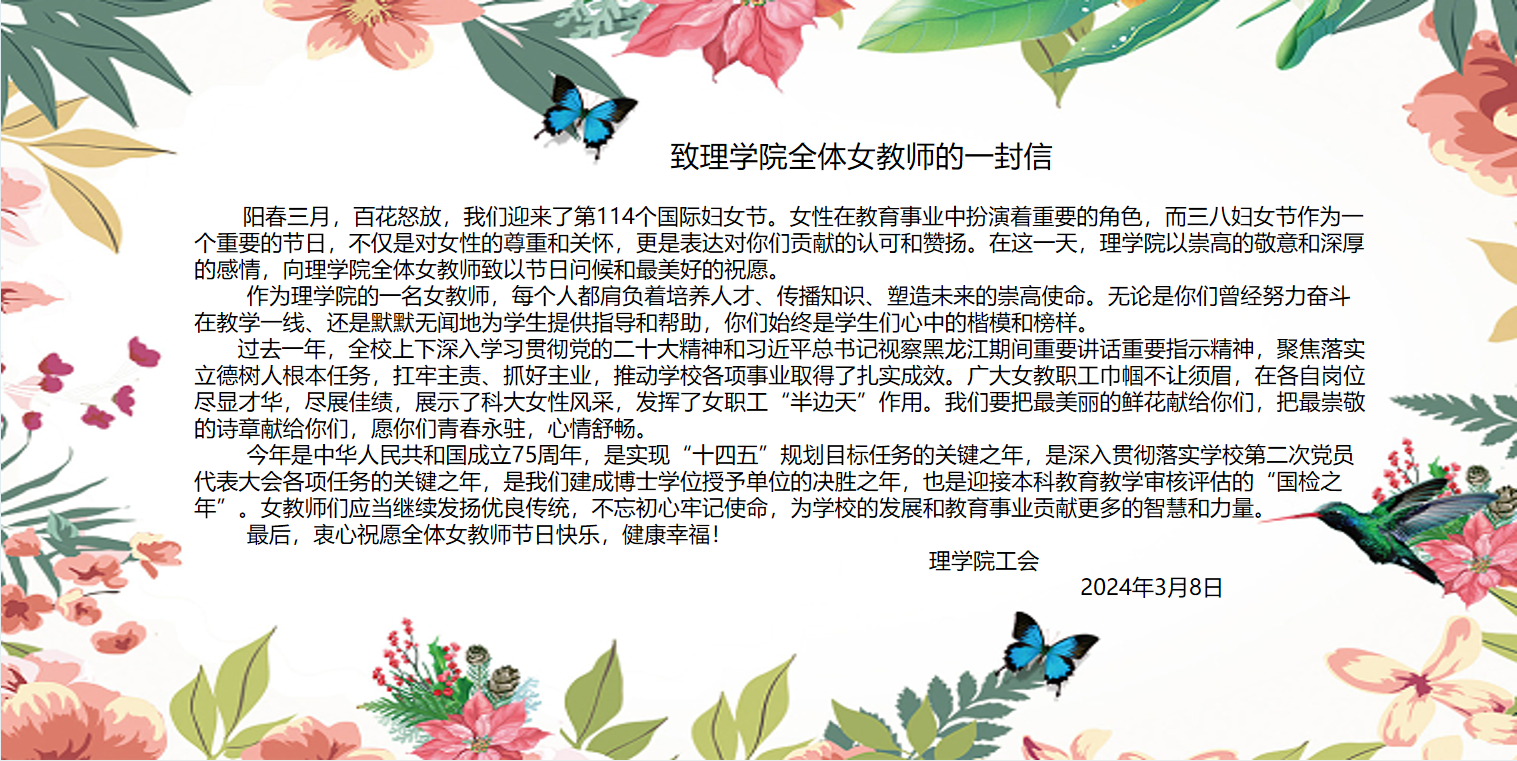 3月8日,公司在工作群里送出“致ladbrokes立博全体女教师的一封信”,向ladbrokes立博全体女教师致以节日问候和最美好的祝愿,让每位教师体会到公司大家庭的关心关怀。