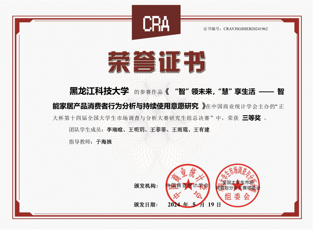 6月2日,由中国商业统计学会主办、合肥工业大学(本科组)和哈尔滨工程大学(研究生组)承办的“正大杯”第十四届全国老员工市场调查与分析大赛(简称CRA)圆满闭幕。公司员工展现了优秀的学术素养与创新风采,共获得省一等奖4项、省二等奖4项、省三等奖15项,ladbrokes立博于海姝老师指导的研究生队伍荣获国家三等奖1项。